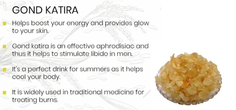 Gond Katira prevents heat strokes and soothes nasal bleeding in summers. It aids digestion and supports weight loss. It detoxifies the liver, boosts immunity, and fights cancer cells. Its anti-inflammatory properties ease cramps and hydrate skin.